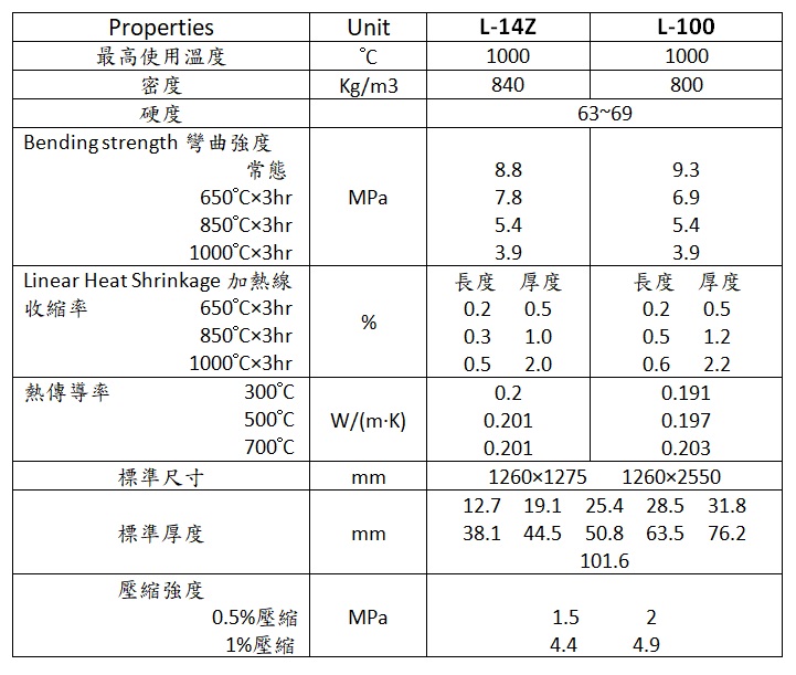 以優良耐熱性的硬硅酸鈣為主要料,並配合有特殊強化纖維的高耐熱高隔熱的隔熱板,且具有在高溫下尺寸穩定性及機械加工性強的優點,依使用條件分成 L-14Z 和 L-100 兩種類型: