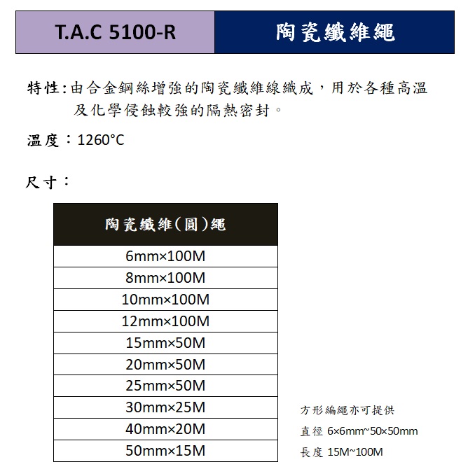 陶瓷纖維繩T.A.C 5100-R