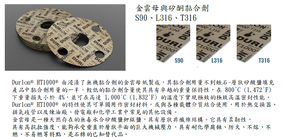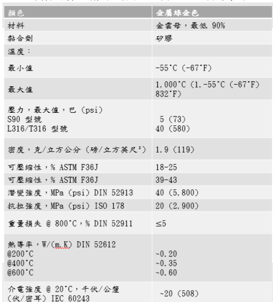 L316:浸漬無機黏合劑的金雲母紙,與 0.002 英吋厚的 316 不銹鋼載體層壓。 T316:浸漬無機黏合劑的金雲母紙,與 0.004 英吋厚的 316 不銹鋼穿孔載體層壓。